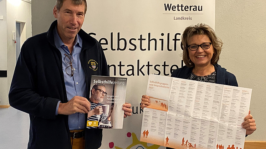 Prof. Dr. Reinhold Merbs und Anette Obleser präsentieren die aktuell erschienene 47. Selbsthilfezeitung und das Faltblatt der für 2024 aktiv gemeldeten Selbsthilfeangebote.