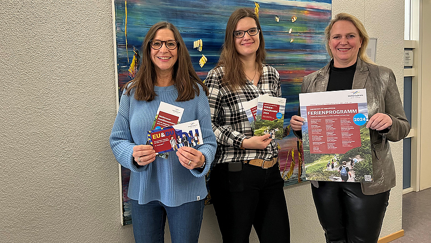 Fachstellenleitung Jugendarbeit Christiane Volk, Kreisjugendpflegerin Josephin Koch sowie Erste Kreisbeigeordnete und Sozialdezernentin Stephanie Becker-Bösch stellen das Programm vor.