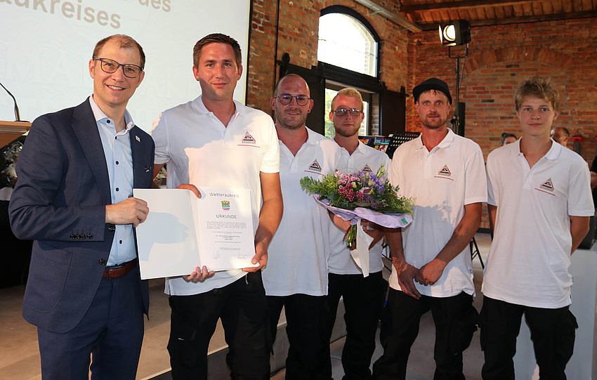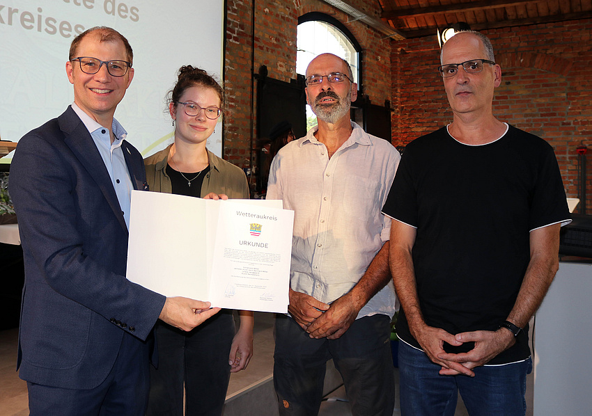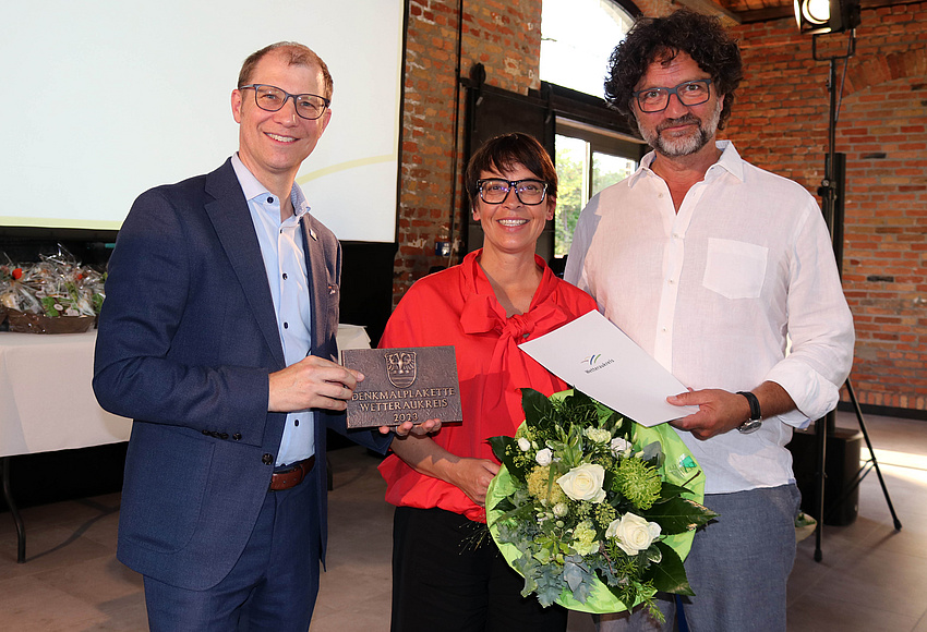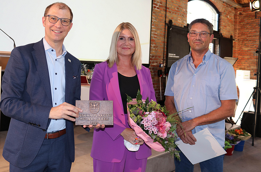 Vier denkmalgeschützte Objekte in Karben, Limeshain, Münzenberg und Friedberg wurden mit der diesjährigen Denkmalplakette des Wetteraukreises ausgezeichnet. Die Verleihung fand im historischen Ambiente eines der ausgezeichneten Objekte statt, in der ehemaligen Gewerbehalle „Taunusbrunnen“ in Karben-Kloppenheim. Landrat Jan Weckler würdigte das Engagement der Eigentümer und ihren herausragenden Umgang mit denkmalgeschützter Bausubstanz. Und auch darum geht es bei der Auszeichnung: den Denkmalschutz ins Bewusstsein der Öffentlichkeit rücken.