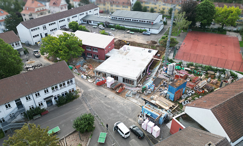 Auf dem Schulgelände wächst nun Schritt für Schritt ein dreigeschossiger Bau in die Höhe, der in allen Geschossen an das Bestandsgebäude angeschlossen wird. Aufgrund der Geländetopographie befindet sich das Gebäude in Hanglage zwischen den beiden Schulhofebenen. Daher wird das Untergeschoss über den unteren Schulhof und das Erdgeschoss über den oberen Schulhof ebenerdig erschlossen. In dem Erweiterungsbau werden unter anderem Klassenräume, Gruppenräume, ein Speise- und Mehrzweckraum sowie ein Küchenbereich entstehen. Im Bestandsgebäude werden in Folge des Anbaus ebenfalls kleinere Umbaumaßnahmen notwendig. Zudem wird die Außenanlage um das erweiterte Gebäude herum neu gestaltet. Außerdem werden neben dem Sportfeld künftig Parkplätze für die Lehrkräfte zur Verfügung stehen.