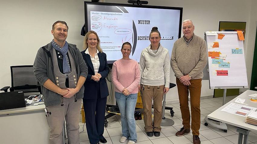 Bei der Bescheidübergabe für die Digitalisierungsoffensive am ABZ, von links: Daniel Bach, Ausbildungsleiter ABZ Nidda, Erste Kreisbeigeordnete Birgit Weckler, Silvia Kirmis von derGesellschaft für Wirtschaftsförderung und Regionalentwicklung im Wetteraukreis mbH, Alexandra Freitag vom ABZ und Niddas Erster Stadtrat Thomas Repp.