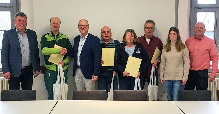 Freuen sich über den Verfahrensabschluss (von links): Rosbachs Bürgermeister Steffen Maar, TG-Vorstandsmitglied Rainer Schütz, Matthias Höhn (Verfahrensleiter, Amt für Bodenmanagement), TG-Vorstandsmitglied Wolfgang Blecher, TG-Vorstandsmitglied Ute Albrecht, TG-Vorstandsmitglied Hans Otto Köster sowie Monika Bohm und Volker Matthesius (Wetteraukreis). Auf dem Bild fehlen die Vorstandsmitglieder Frank Metzger und Jürgen Stetzer.