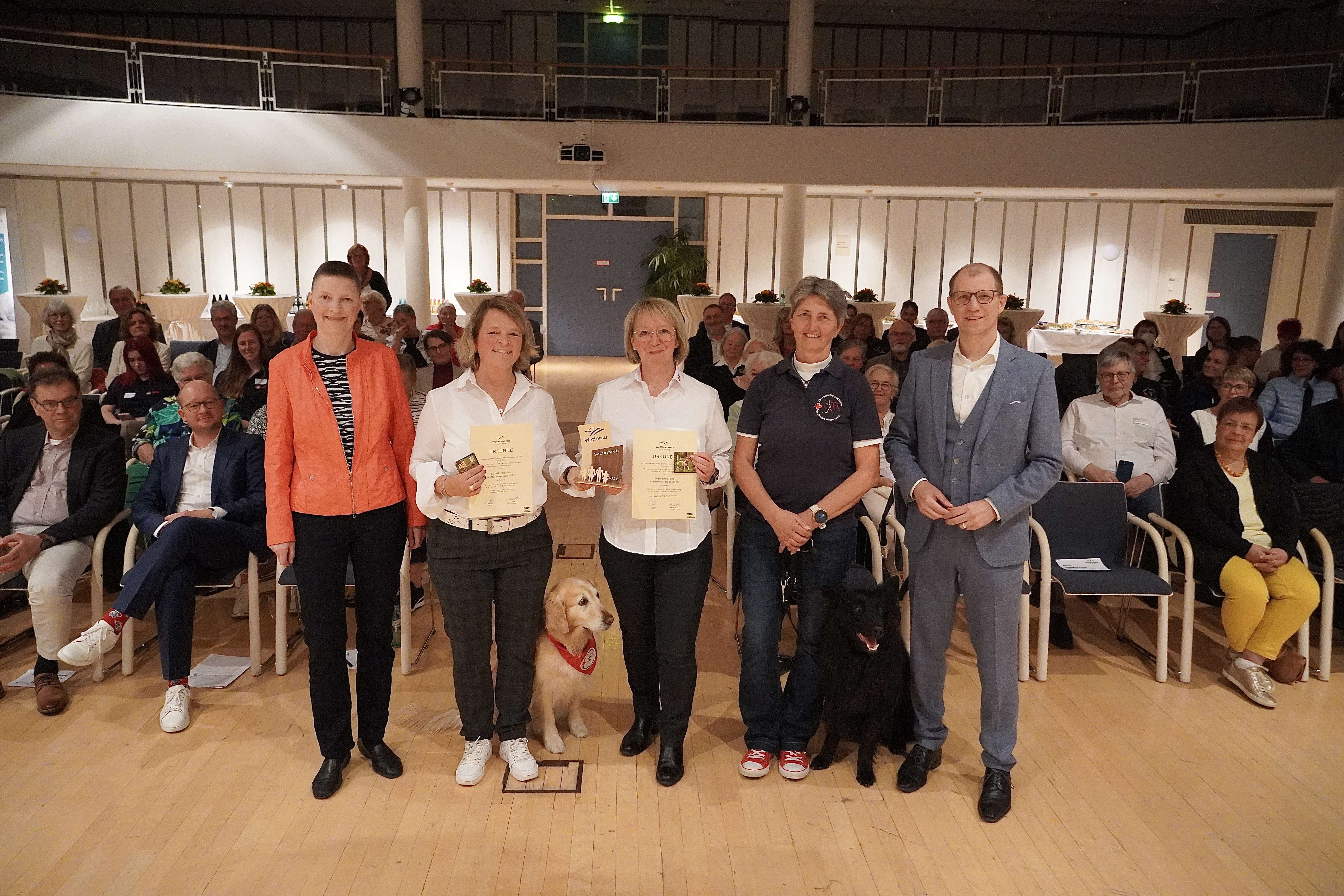 Kreisbeigeordnete Marion Götz und Landrat Jan Weckler übergeben die Urkunde an Christina Paulencu (Therapiehunde-Teams DRK-Kreisverband Friedberg), Melanie Ganz und Daniela Fass (Therapiehunde-Teams DRK-Kreisverband Büdingen) mit Frida und Luigi.