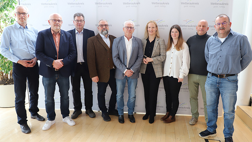 Vertreterinnen und Vertreter des Wetteraukreises und von Hessen Mobil haben für 2025 zwölf Straßenbauprojekte im Gebiet des Wetteraukreise in Planung (von links): Christian Sperling (Wetteraukreis), Frank Caspar (Hessen Mobil), Stefan Wald (Hessen Mobil), Helmut Klein (Hessen Mobil), Helmut Köhler (Hessen Mobil), Erste Kreisbeigeordnete Birgit Weckler, Monika Bohm (Wetteraukreis), Volker Matthesius (Wetteraukreis) und Volker Repp (Hessen Mobil).