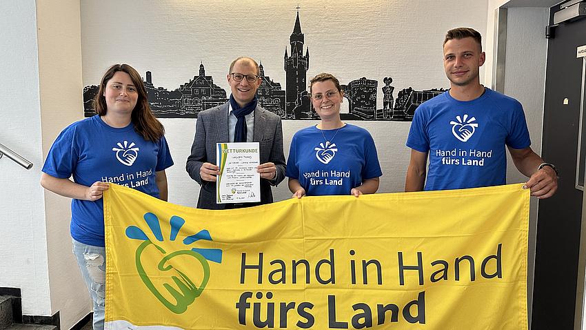Wetten mit Landrat Jan Weckler: Elisa Friedewald, Johanna Friedewald und Marc Werner aus dem Vorstand der Landjugend Friedberg.