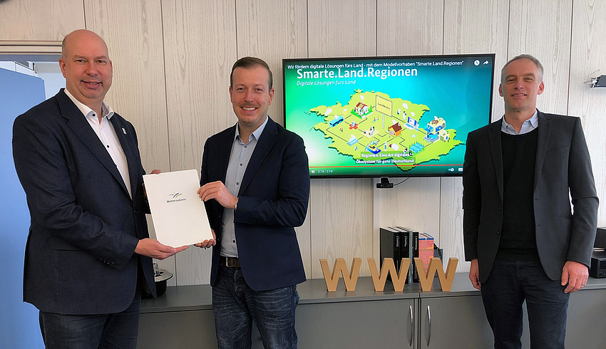 Archivbild: Kreisbeigeordneter Matthias Walther, Martin Langlitz vom Fachbereich Regionalentwicklung und Umwelt sowie Fachbereichsleiter Christian Sperling freuten sich über die Aufnahme des Wetteraukreises in das Programm Smarte.Land.Regionen. Nun wird die Strategie in Nidda vorgestellt.