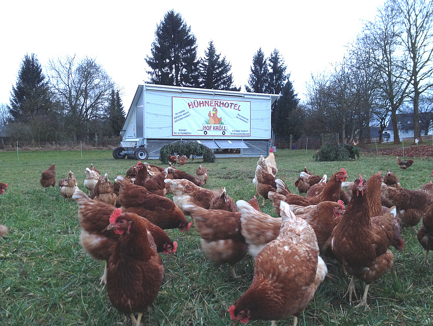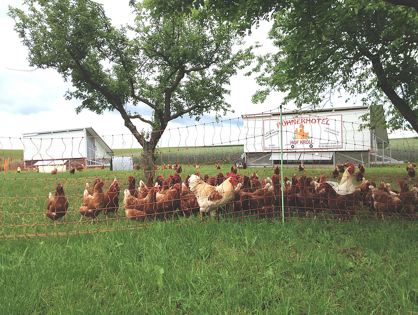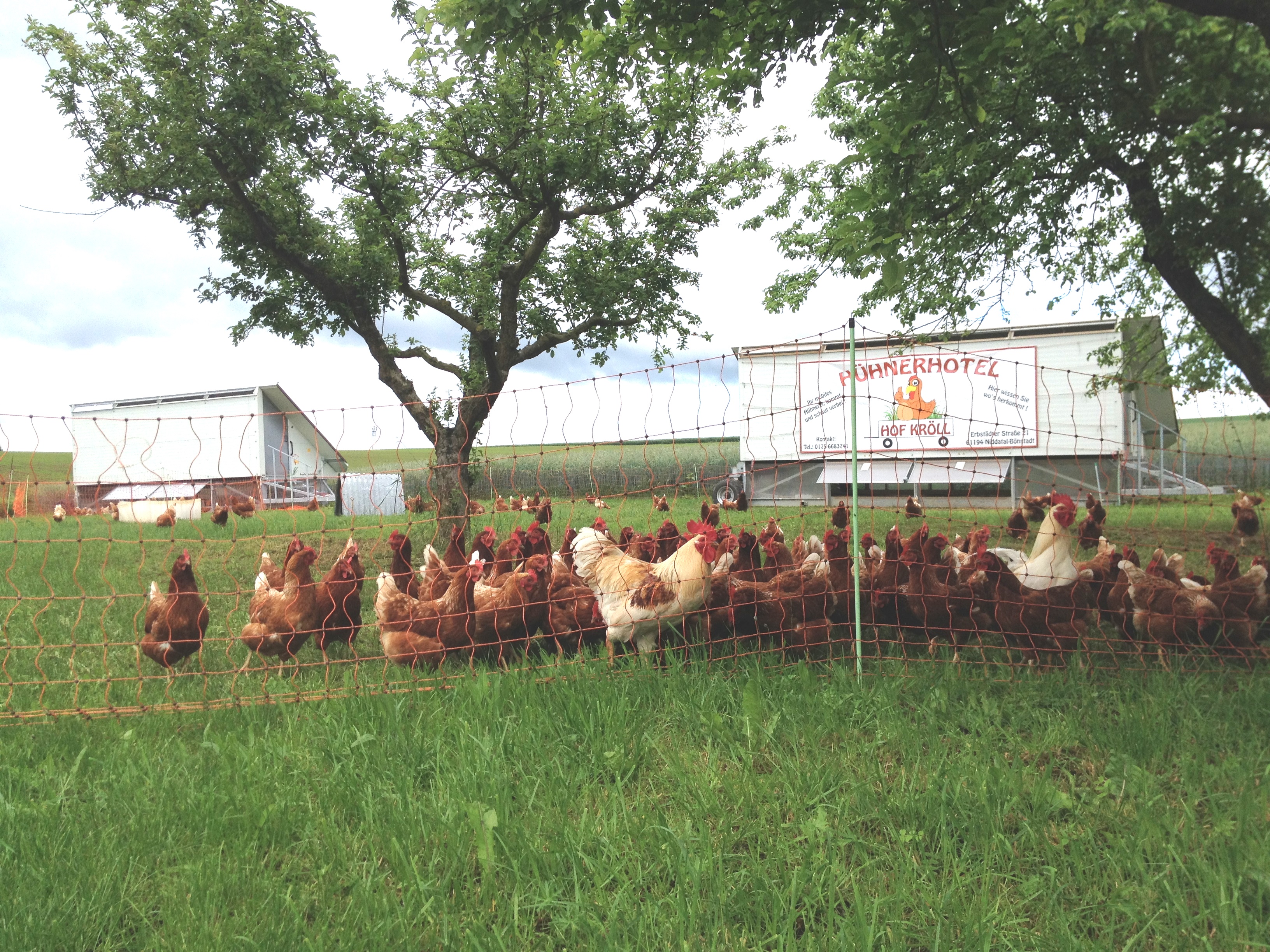 Im Hühnerhotel Hof Kröll geht es den Hühnern richtig gut. Sie können frei auf der Wiese umherlaufen und ein Hahn ist auch mit dabei. An Luxus fehlt es ihnen ebenfalls nicht. So gibt es im Hühnerhotel solarbetriebene Türöffnungen, die sich morgens automatisch öffnen und abends wieder automatisch schließen. Dadurch sind die Hühner nachts vor Fuchs und Marder geschützt. Die Familie Kröll besitzt neun Hühnermobile, die immer an unterschiedlichen Standorten stehen.Eine kulinarische Köstlichkeit ist der eigen hergestellte Eierlikör.