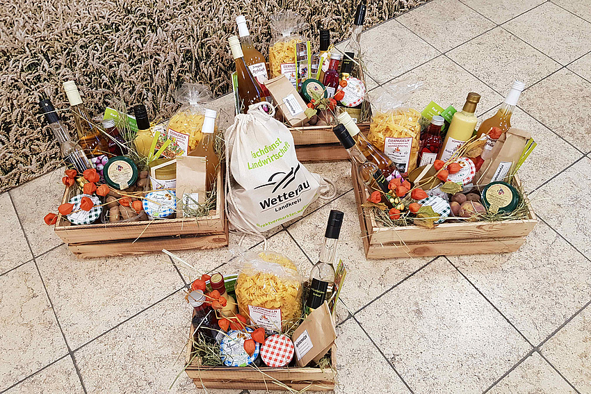 Präsentkisten gefüllt vom Fachdienst Landwirtschaft mit Produkten der Direktvermarkter des Wetteraukreises - Eine nachhaltige Idee! (Foto: Kathrin Hintze)
