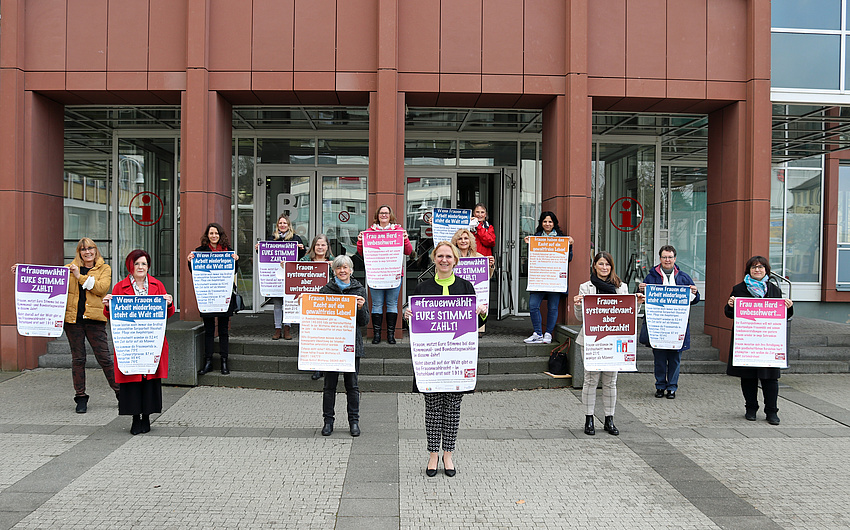Wer am 8. März auf der Kaiserstraße etwas erledigt, wird nicht umhin können über einige große, bunte Bodenaufkleber zu stolpern. „Frauen wählt - Eure Stimme zählt! oder „Frauen – systemrelevant, aber unterbezahlt!“ ist da zu lesen. Das Wetterauer Aktionsbündnis macht zum 8. März mit einer groß angelegten Bodenaufkleberaktion auf die Rechte von Frauen und noch bestehende Benachteiligungen aufmerksam. An 12 Standorten werden hierfür Aufkleber zu verschiedenen Themen geklebt, wie z.B. die weiterhin bestehende Lohnungleichheit zwischen Frauen und Männern, das Recht auf ein gewaltfreies Leben oder die Aufwertung von Pflegeberufen und Care-Arbeit. Die Aufkleber sind in der Zeit vom 8. – 15. März zu sehen.