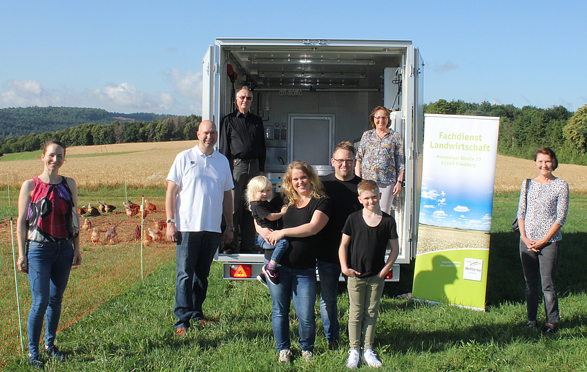 Geflügelschlachtmobil (Personen 1. Reihe von links nach rechts: Claudia Zohner, Koordinatorin der Modellregion Ökolandbau Wetterau, die Betreiber Marcel und Lisa Emrich mit Kindern, die hessische Tierschutzbeauftragte Dr. Madeleine Martin. 2. Reihe von links nach rechts: Mathias Walther, zweiter Kreisbeigeordneter und Landwirtschaftsdezernent, Dr. Hendrik Kamps, Fachdienst Landwirtschaft und die Leiterin der Fachstelle Lebensmittelüberwachung Dr. Veronika Ibrahim