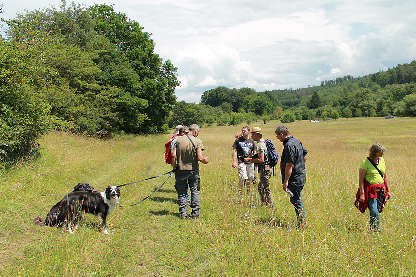 Nach eingehender Erläuterung zur Beweidung und Flächenzuständen sowie gemeinsamer vegetationskundlicher Diskussion, ging es im Anschluss zum nahegelegenen Naturschutzgebiet (NSG) Bleichenbachtal, das westlich von Bergheim liegt. Das NSG wird von Magerrasen und Feuchtwiesen geprägt, die im Auenbereich des naturnahen und strukturreichen Bleichenbachs zu finden sind. Die bunt blühenden Flächen sind Lebensraum vieler verschiedener Tiere und Pflanzen, die auf die wasserreichen Auenwiesen oder die nährstoffarmen Magerrasen angewiesen sind.