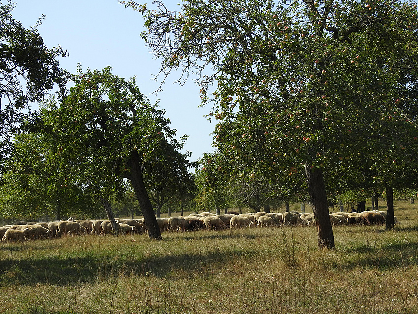 Zufrieden zieht die Schafherde über eine Streuobstwiese. Schäfer Wilhelm Weißelberg hält seine Tiere fast ausschließlich im Weidegang. Nur in strengen Wintern, mit tiefen Temperaturen, sind die Tiere im Stall.