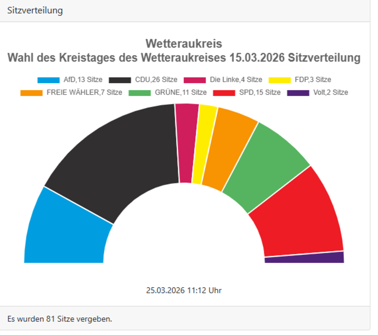 Der Kreistag des Wetteraukreises besteht aus 81 Abgeordneten. Gegenwärtig setzt er sich zusammen aus: 26 Christdemokraten, 15 Sozialdemokraten, 13 Vertreter/innen der AfD, 11 Vertreter/innen von Bündnis 90/Die Grünen, 7 Vertreter/innen der Freien Wähler, 4 Vertreter/innen der Linken, 3 Vertreter/innen der FDP und 2 Vertreter/innen von Volt.